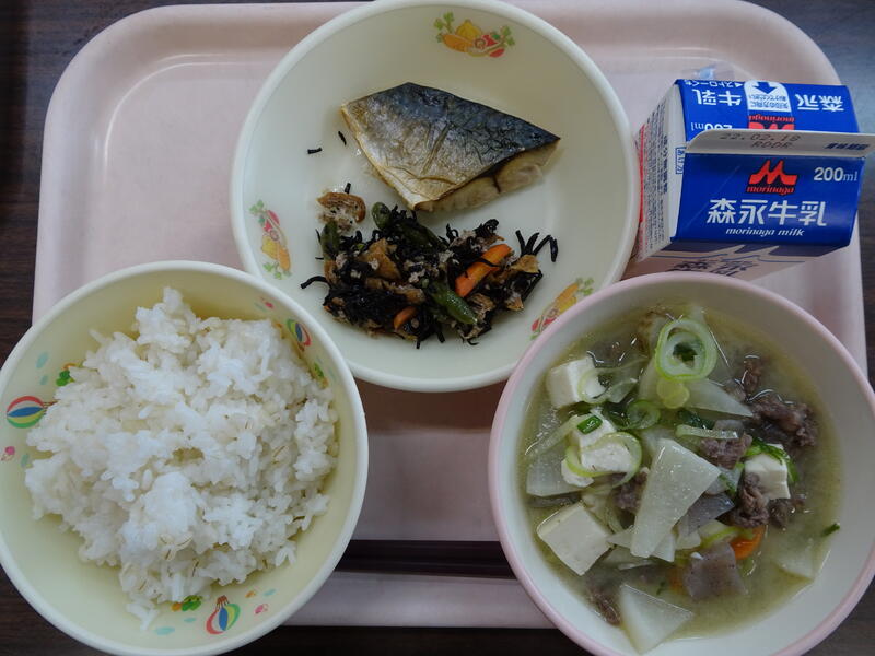 麦ご飯、牛乳、馬汁、さばの塩焼き、ひじきの煮物