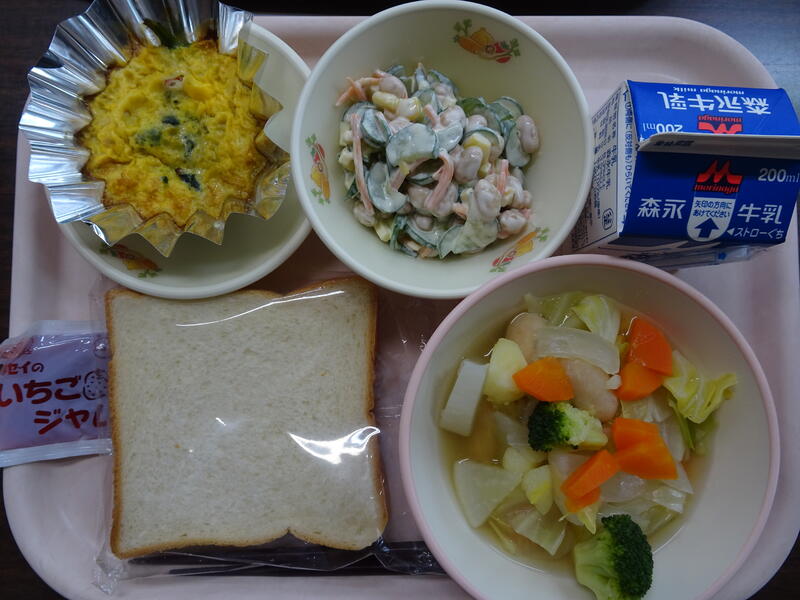 食パン、牛乳、ポトフ、キッシュ、大豆のサラダ、いちごジャム
