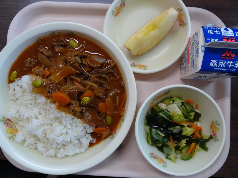 ハヤシライス、牛乳、シーフードサラダ、りんご