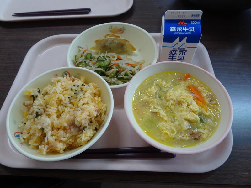 キムチご飯、牛乳、スーミータン、餃子、ごま酢和え