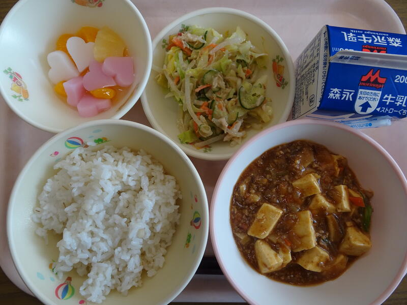 麦ご飯、牛乳、マーボー豆腐、バンバンジーサラダ、バレンタインデザート