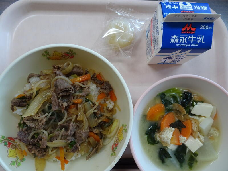 牛丼、牛乳、大根の味噌汁、いきなり団子