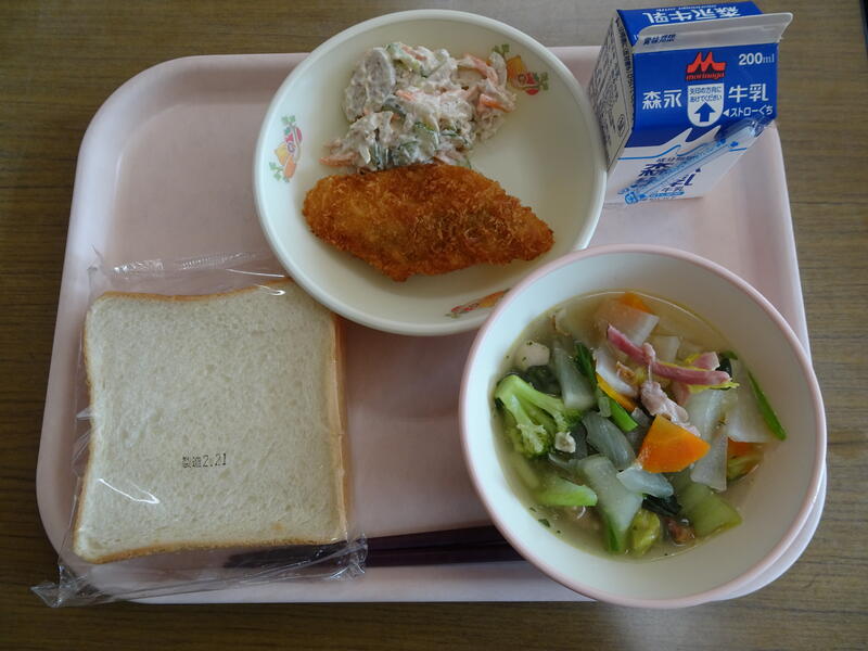 食パン、冬野菜スープ、白身魚フライ、蓮根のサラダ