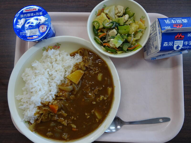 カレーライス、牛乳、豆腐サラダ、ヨーグルト