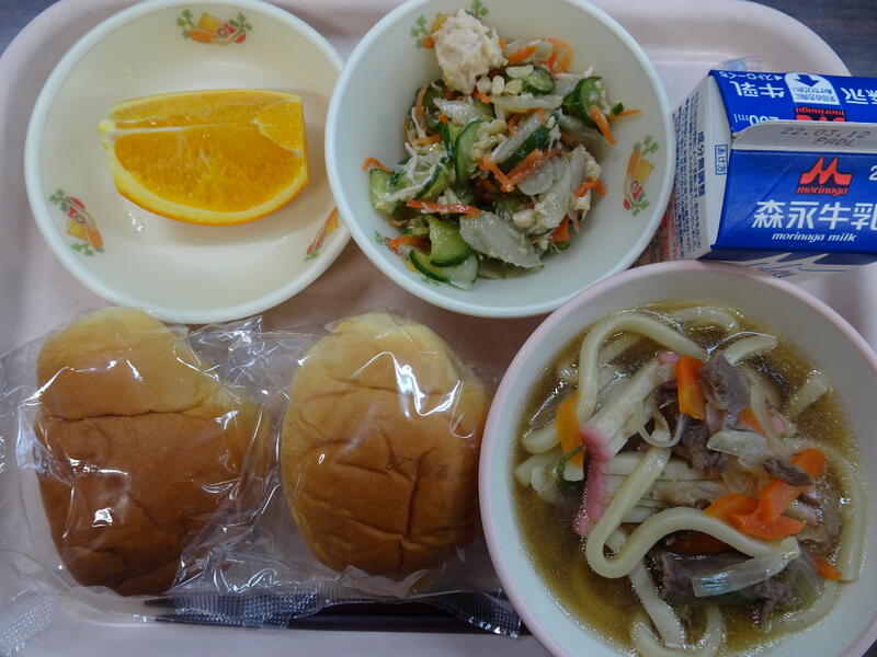 ロールパン、牛乳、肉うどん、ごぼうサラダ、ネーブル