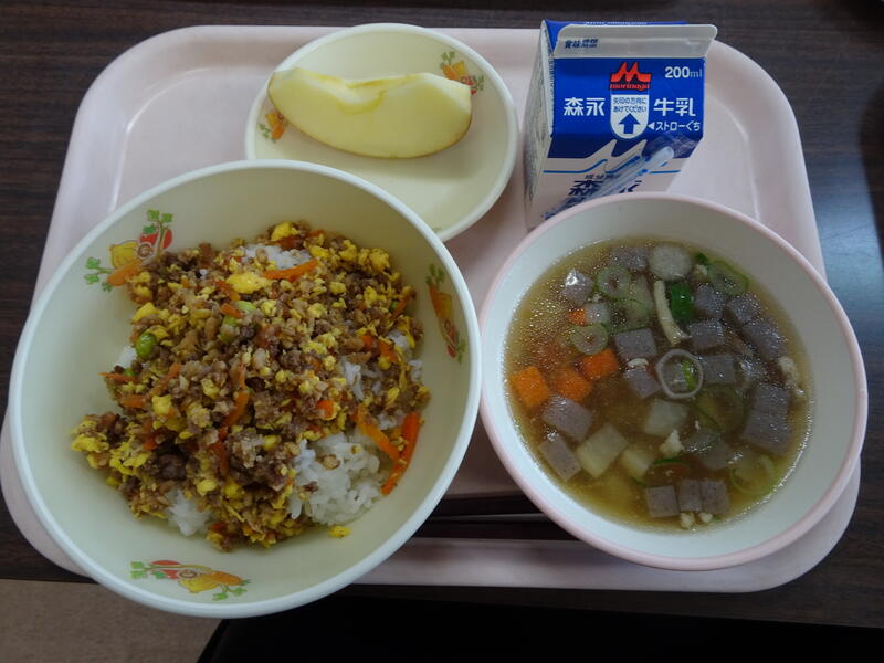 馬そぼろ丼、牛乳、のっぺい汁、りんご