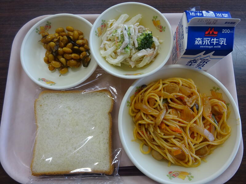 食パン、牛乳、スパゲティナポリタン、大根サラダ、座禅豆