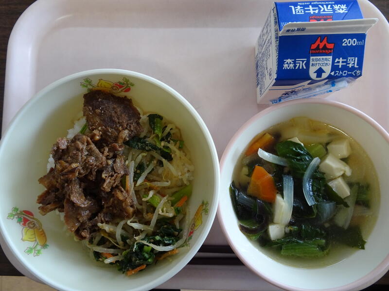 ビビンバ、牛乳、豆腐とわかめのスープ