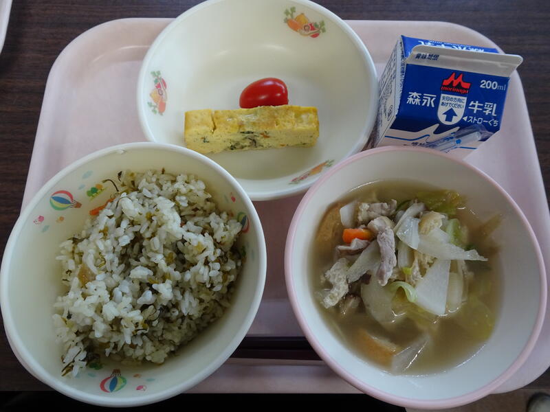 高菜ご飯、牛乳、団子汁、千草焼、ミニトマト