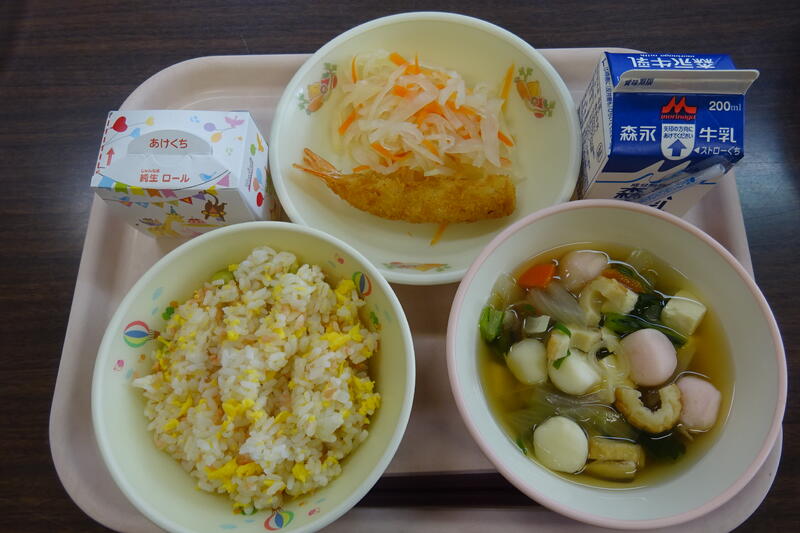 梅じゃこご飯、牛乳、にら玉汁、県産真鯛の天ぷら、チンゲン菜のサラダ