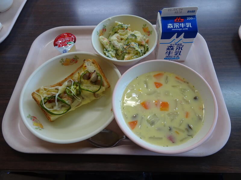 ピザパン、牛乳、コーンスープ、ポテトサラダ、ゼリー
