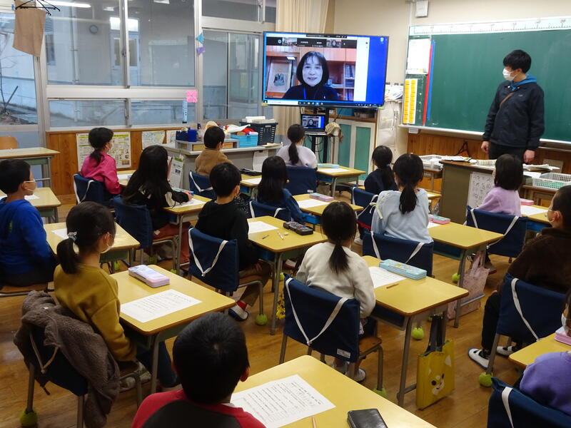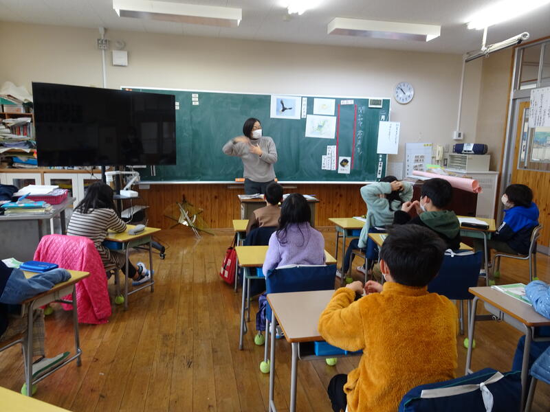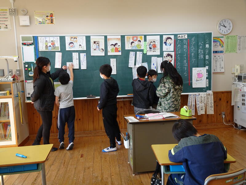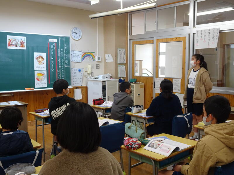 花丸4年生は梅田教頭先生の授業で「三つのつつみ」から、親切、人を思う心、やさしい心を考えました。次に来る見知らぬ人への思いやりが次へと連鎖することに気づき、学校生活と重ねて振り返っていました。