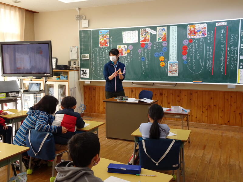 花丸4年生の外国語活動の学習です。体育館などの施設を表す言葉を使って、場所の説明をする言い方を学びました。