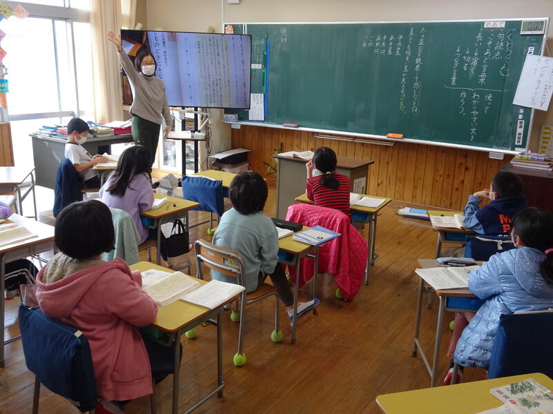 花丸1年国語「どうぶつの赤ちゃん」では、先生と子どもたちが「追いかけ読み」の音読をしていました。みんな、教科書を指でたどりながら真剣に読んでいます。