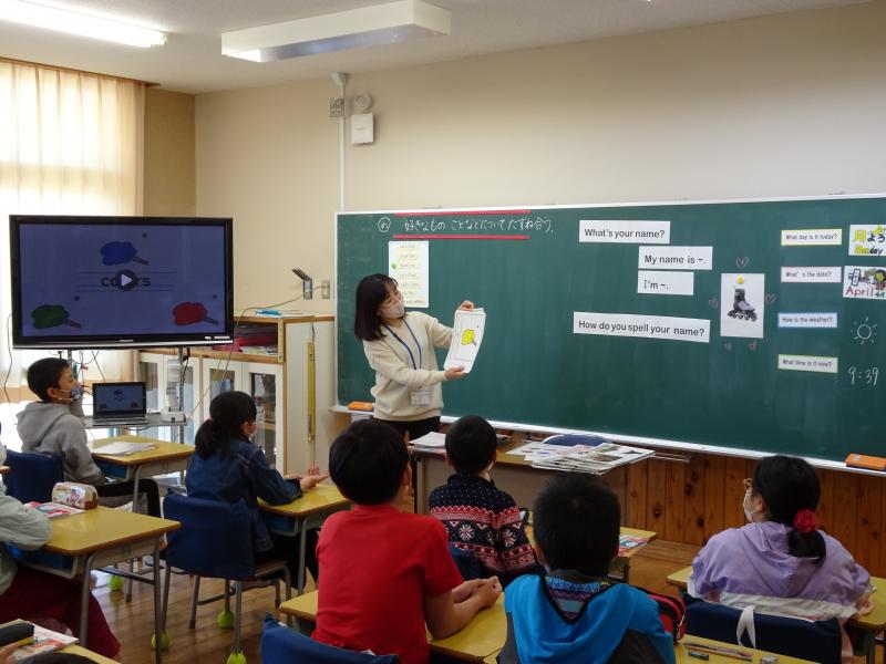 5年生は、英語専科の齋賀先生と英語の会話の学習をしていました。好きなものを英語で伝え合えたかな?