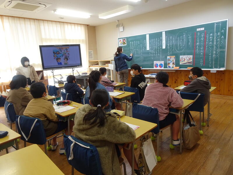 1年生は、安全なくらしについて気をつけることを考えました。休み時間にはどんな過ごし方をすればいいのかな? たくさん手を挙げて発表できました