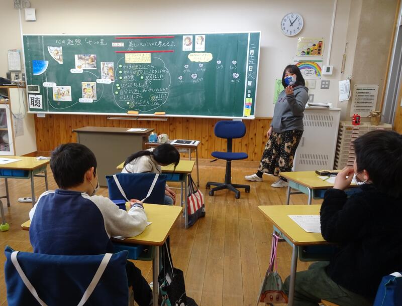 2年生は”やさしいことをするとダイヤモンドがひしゃくから生まれて空に輝く”「七つの星」のお話を読みました。2年生の黒板にも2年生のみんなのやさしいことのダイヤモンドがたくさん輝きました