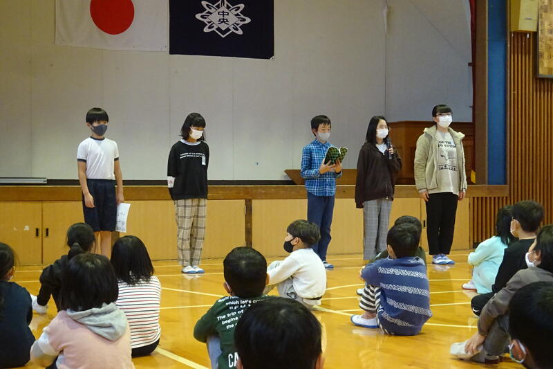 今日の火曜集会は、11月の月目標のふり返りと、12月の月目標の周知の時間でした! 「きれいにハートの実をつけた”ありがとうの木”」、手洗いうがいがしっかりとできたかの反省、運営委員会と健康給食委員会の子どもたちが立派に発表しました