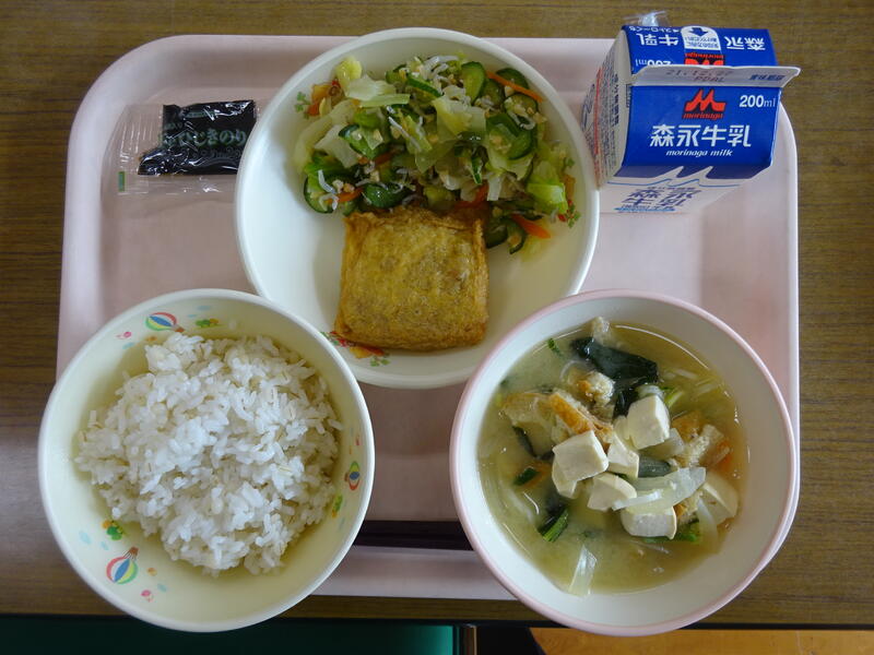 麦ご飯、牛乳、みそ汁、ひじきのり佃煮、肉詰めいなり、じゃことナッツのサラダ