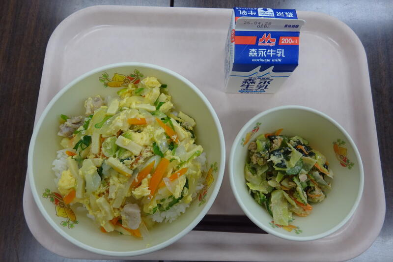 今日のメニュー:麦 ごはん、牛乳、親子丼の具、わかめとツナのごまサラダ