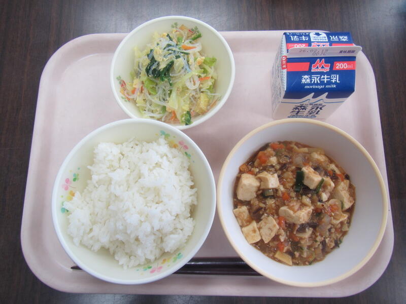 今日のメニュー :有機米ごはん、マーボー豆腐、にらと春雨のあえもの、牛乳