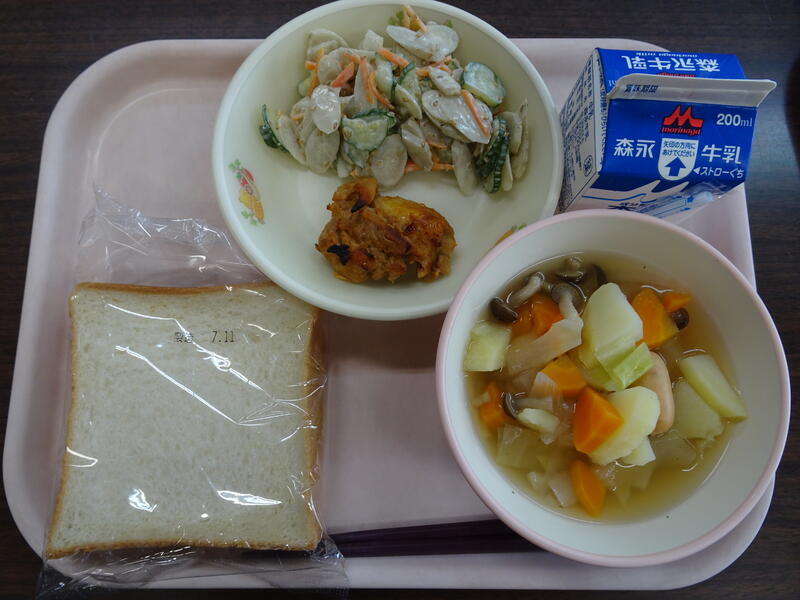 本日の献立:食パン・野菜のスープ煮・タンドリーチキン・ごぼうサラダ・牛乳