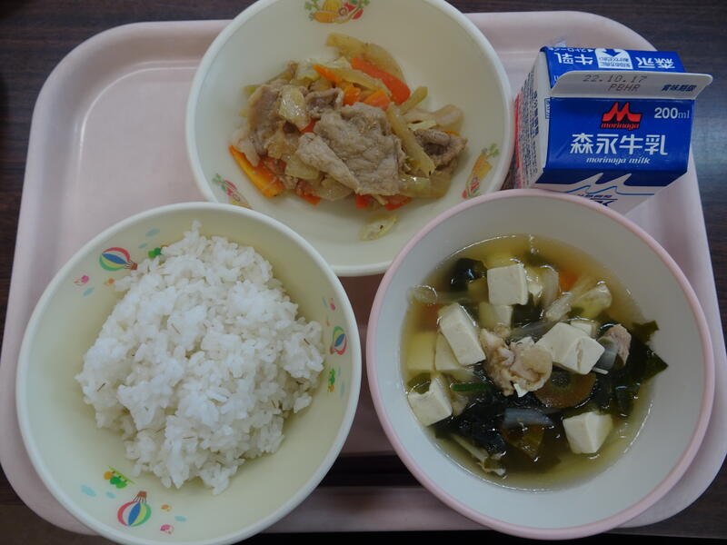 本日の献立:麦ごはん・豆腐汁・豚肉の生姜焼き・牛乳