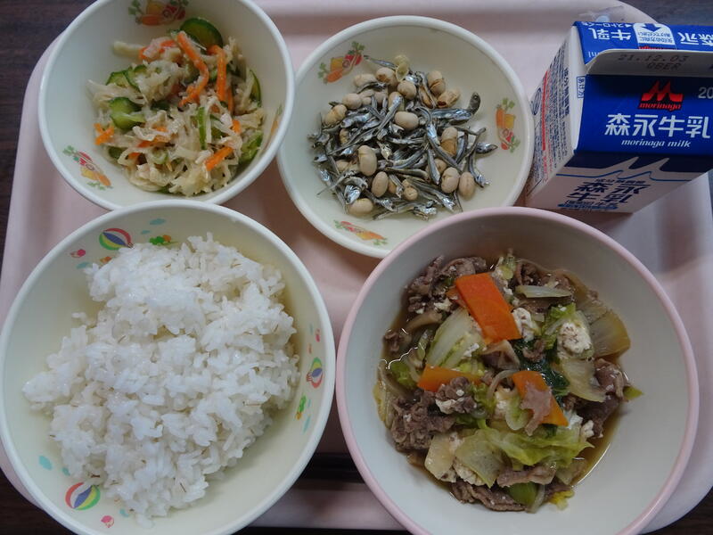 麦御飯、牛乳、肉豆腐、切干大根の酢の物、大豆いりこ