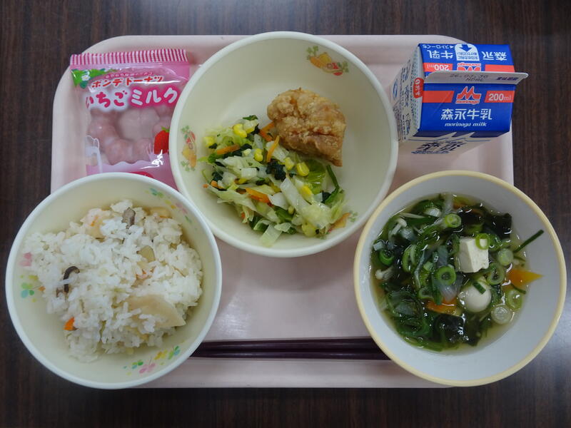 本日のお品書き:ちらし寿司・うずら卵のすまし汁・鶏の唐揚げ・千草あえ・お祝いデザート・牛乳