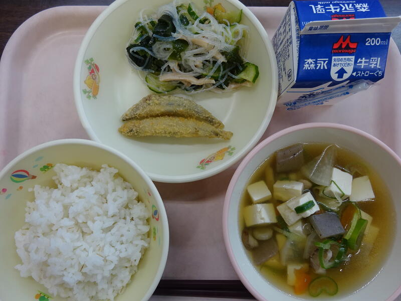 本日の献立:麦ごはん・けんちん汁・春雨の酢の物・きびなごごまフライ・牛乳
