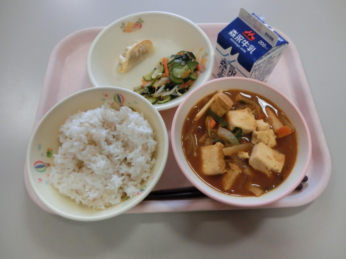 | むぎごはん チャージャンどうふ やきぎょうざ みふねがわのナムル 牛乳 |
