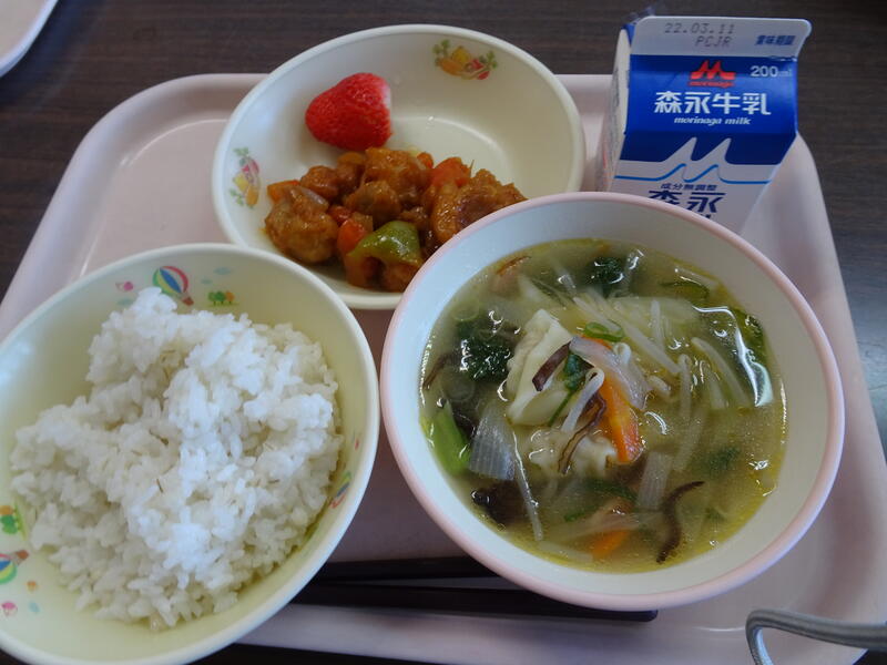 麦ご飯、牛乳、ワンタンスープ、酢鶏、いちご