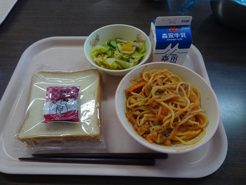 食パン、牛乳、トマトクリームスパゲティ、でこぽんサラダ、マーシャルビーンズ