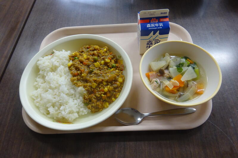 本日のお品書き:大豆入りドライカレー(麦ごはん・ドライカレーのルウ)・野菜スープ・牛乳