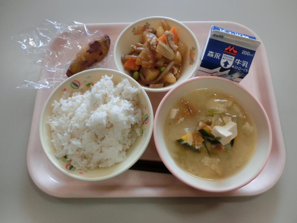 | むぎごはん かぼちゃのみそしる ぶたかくに やきいも 牛乳 |