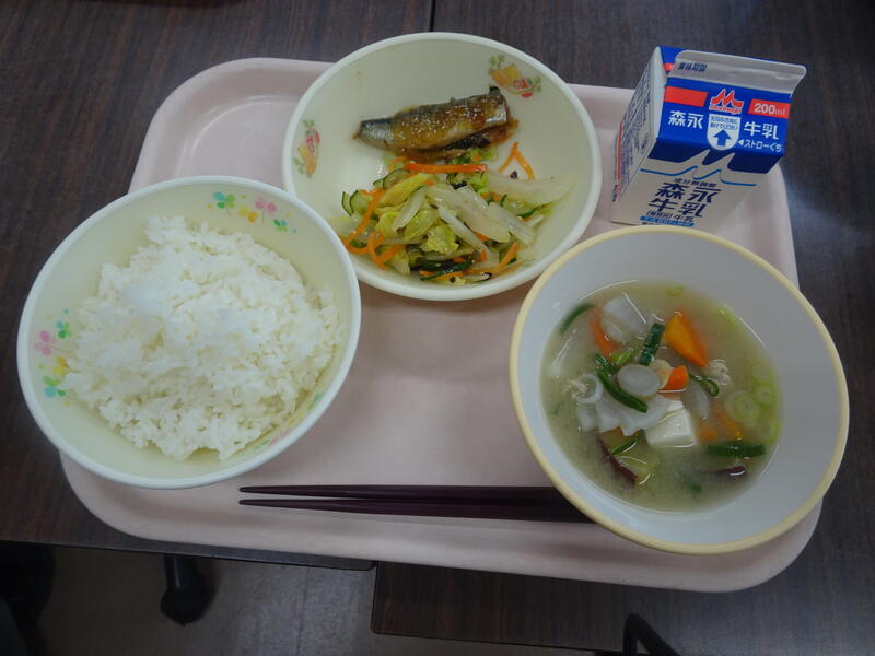 今日のメニュー :有機米ごはん、さつま汁、いわしのみぞれ煮、白菜の昆布あえ、牛乳