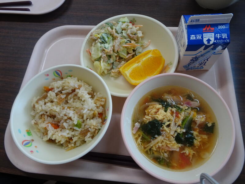 生姜の里ご飯、牛乳、トマトかき玉汁、ちくわのマヨサラダ、果物