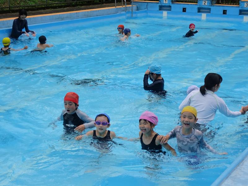3時間目、1,2年生はプールで水遊び。浮いたり潜ったりしていました。