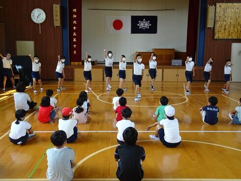 高学年の「表現」は人気アニメの主題歌「残響散歌」を使ってダンスをします。リズムに乗って1つ1つの動きが大きくなってきています。6年生が4,5年生に動きを教える場面もありました。
