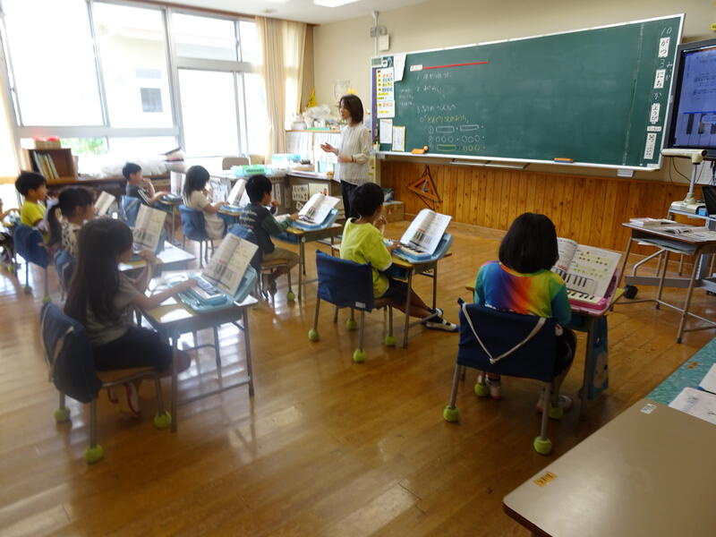 1年生は、鍵盤ハーモニカの演奏をしています。鍵盤ハーモニカで伸ばす音や短く切る音の出し方を練習しています。