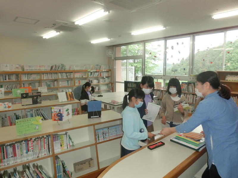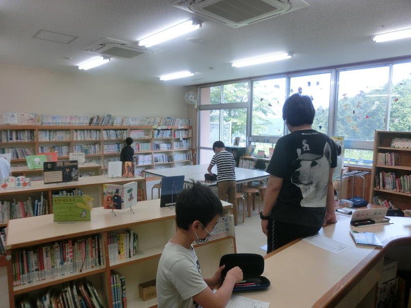 図書室で本を借りています