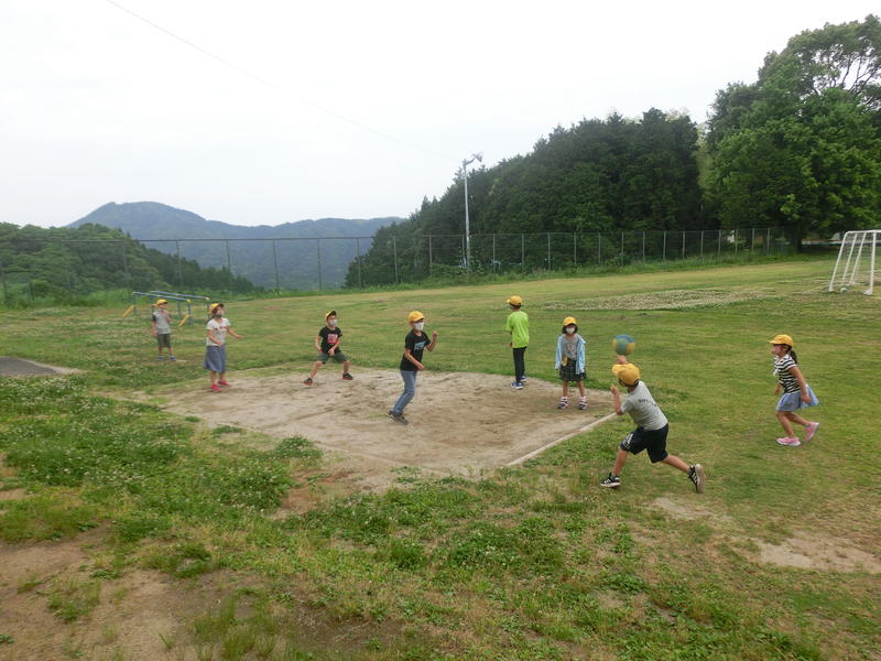 朝の外遊び。20名の児童が運動場で遊んでいました。