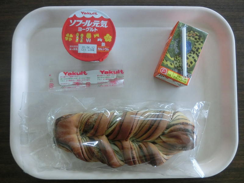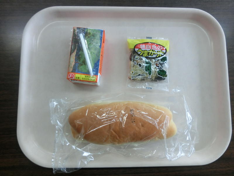 今日の「簡易給食」!チョコ風味のパンを噛むたびに幸せを感じます(^_-)-☆
