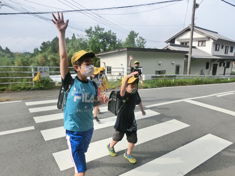 朝の登校。徒歩通学班。手をぴんと高く上げて横断中。6年生がいいお手本ですね。