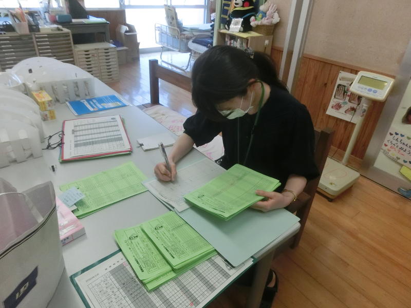 保健室の先生が健康カードをチェック。みんな健康のようですね。