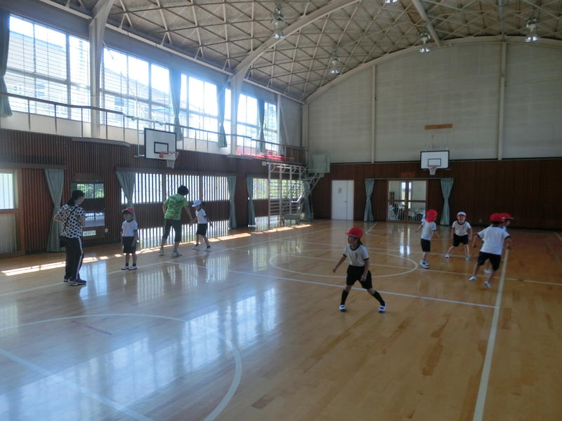 1年生は体育。「反復横跳び」の動きを練習中でした。めざせ、カニカニ忍者!