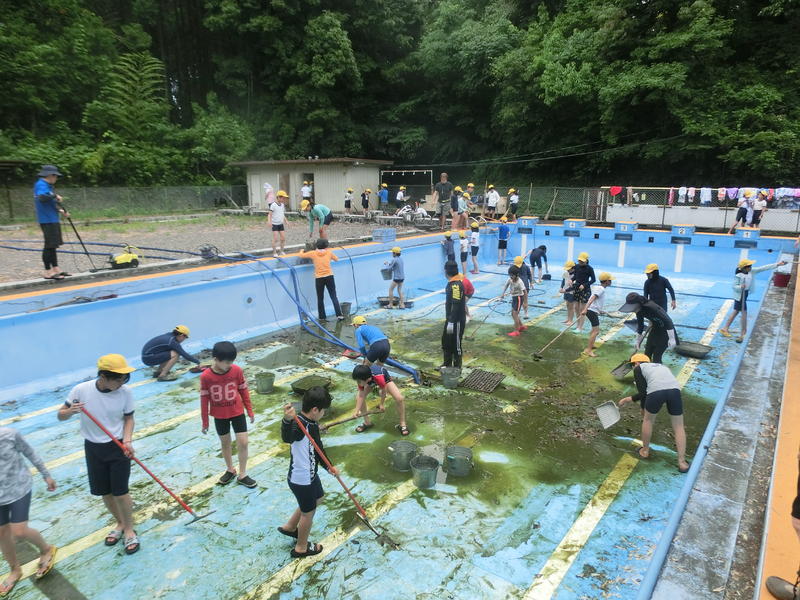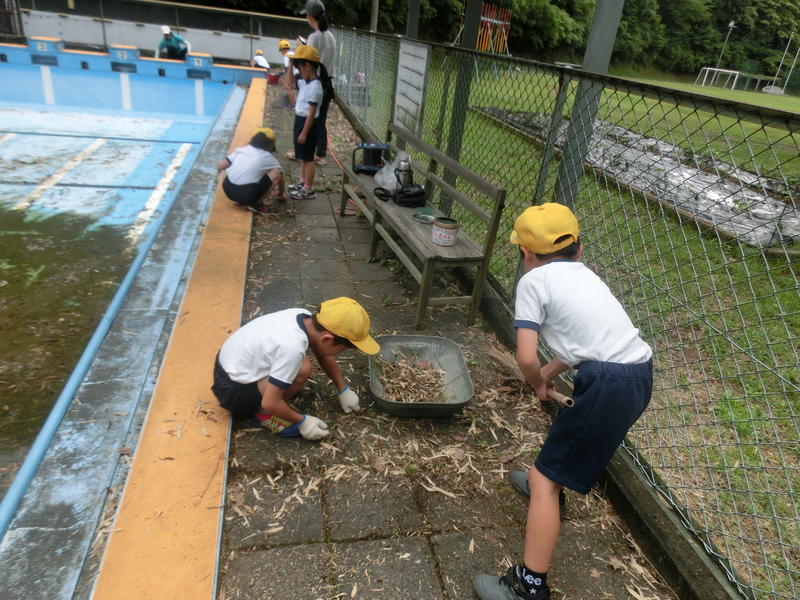 プール掃除をしました。1・2年生がまずは、プールサイドの草取り。3~6年生がプールの中をきれいにしました。みんなで協力して、プールがピカピカになりました。プール開きが楽しみですね。