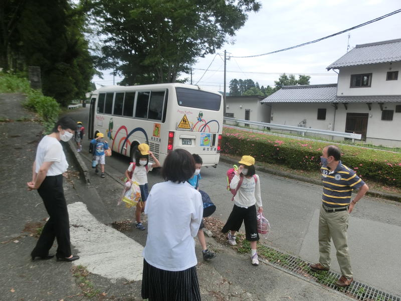 登下校の様子。原田加代子指導主事(上益城教育事務所)が、みんなの登校の様子を見に来られました。原田先生は以前、七滝中央小にお勤めで、「◯◯さんの弟?」「◯◯くんの妹?」と懐かしくされていました。みんなの生き生きとした表情を喜んでおられました。
