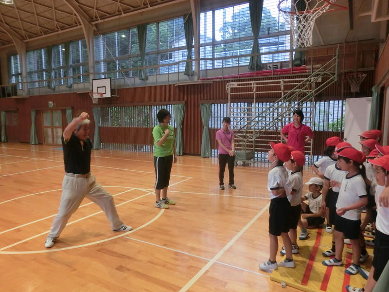 1・2年、体育「忍者の修行」。だるまさんが転んだの変化バージョン「ぞうさんが転んだ」や「ゴキブリさんが転んだ」など工夫されたメニューに、子ども達は笑顔いっぱい、汗いっぱいになって楽く活動していました。鋤崎先生、今日もありがとうございました(^^)/