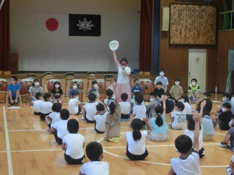 火曜集会。6月の生活目標の振り返りと7月の生活目標の発表がありました。5・6年生が「手洗いと換気をしっかりできました。」と代表で振り返りを発表しました。7月の生活目標は「元気のよいあいさつと返事をしよう」と「熱中症を予防しよう」です。保健室の先生から「3ゴク運動」(給水タイムに必ず3口水を飲む取組)についても説明がありました。みんなで熱中症対策もしっかりしましょう。
